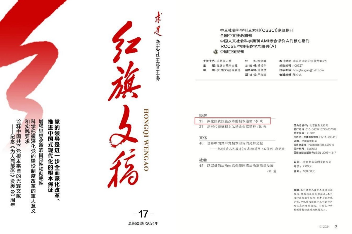 近日,经济学院李政教授在求是杂志社主管主办的《红旗文稿》(2024年第17期)发表题为“深化国资国企改革的根本遵循”的理论文章。